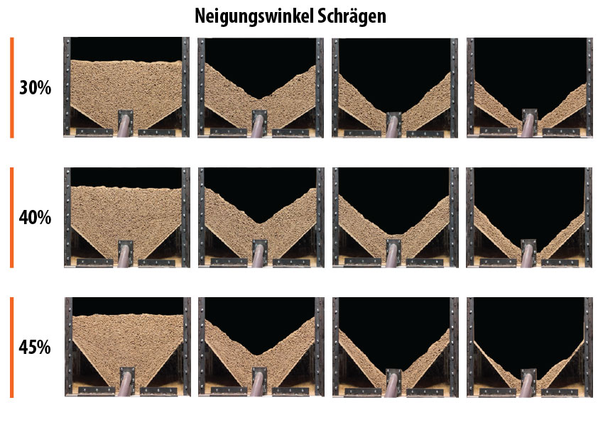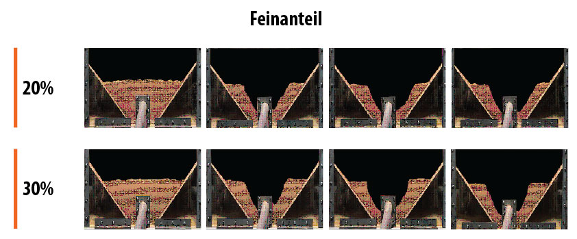 Der Feinanteilgehalt im unteren seitlichen Bereich der Schüttung bestimmt den Schüttwinkel und damit die Rieselmöglichkeit der Pellets.