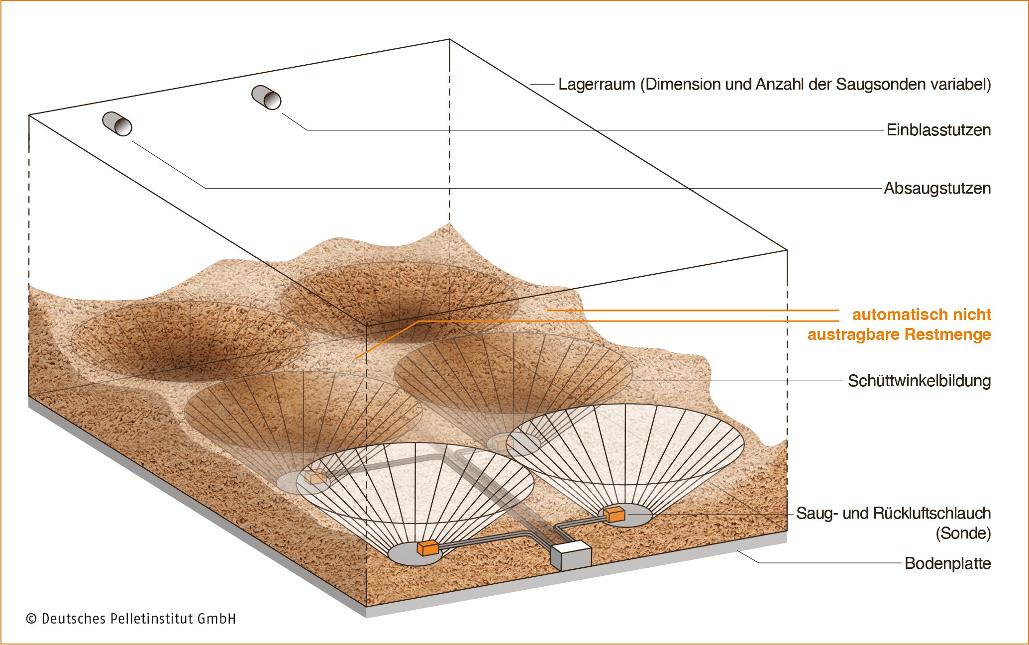 Der Abstand zur Decke bei einem gefüllten Lager ist abhängig von der Anzahl und Lage der Einblasstutzen. Pellets sind keine Flüssigkeit, der Schüttwinkel von Pellets ohne Feinanteil liegt bei ca. 35°. Eingabe des durchschnittlichen Abstands der Pelletschüttung zur Decke.