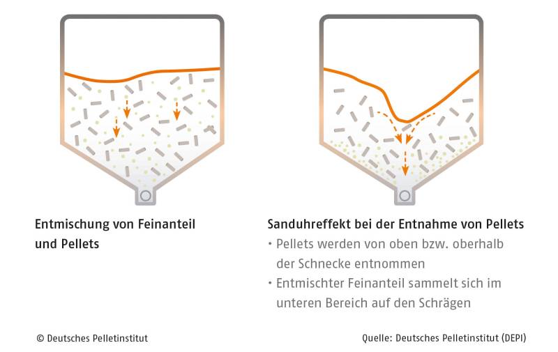 Durch Entmischungsvorgänge beim Austrag der Pellets konzentriert sich der Feinanteil im Laufe der Zeit im unteren Bereich des Pelletlagers. Um eine optimale Funktion der Pelletheizung sicherzustellen, sollte das Lager spätestens nach zwei Jahren vollständig geleert und der Feinanteil entfernt werden. Dazu bieten sich die Sommermonate an.