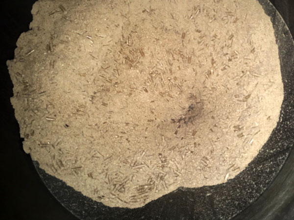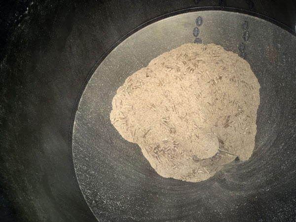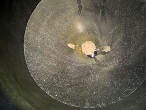 Die folgenden Photos eines Vorlagebehälters einer Sauganlage zeigen die Entnahme der Pellets im Kernfluß bei gleichzeitiger Entmischung des Feinanteils in die Außenbereiche.
