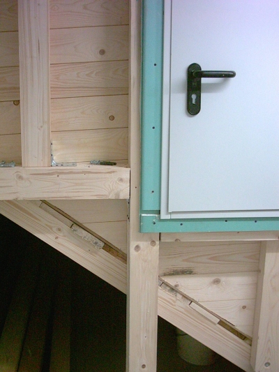 Die halbhohe Tür im Lagerraum sollte einzeln entfernbare Bretter als Hinterbauung haben, sodass auch in gefülltem Zustand der Lagerraum geöffnet werden kann.