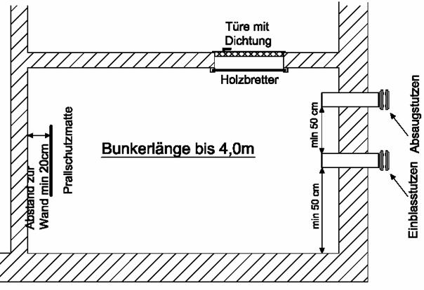 Ein rechteckiger Lagerraum sollte seinen Einblasstutzen an der schmalen Seite besitzen. Wenn dies nicht möglich ist, sollte ab einer Bunkerbreite von über 5 m über 2 Einblasstutzen zur optimalen Füllung nachgedacht werden.