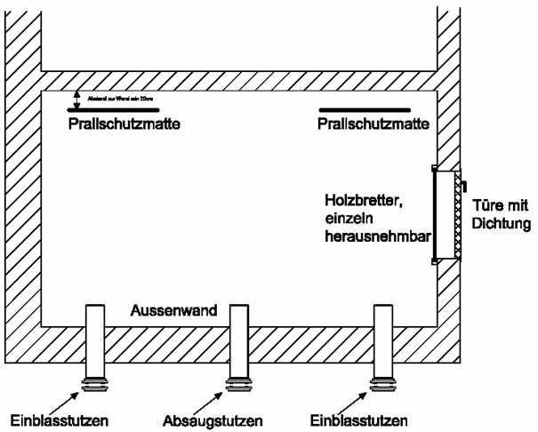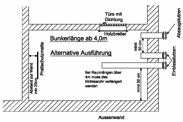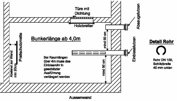 Der Einblasstutzen sollte ca. 15-20 cm unter der Decke angeordnet werden, damit während des Einblasvorgangs kein zu hoher Abrieb unter der Decke entsteht.