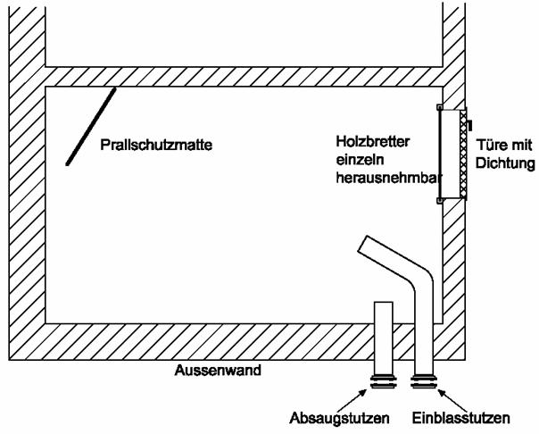 An der dem Einblasstutzen gegenüberliegenden Seite sollte eine Prallmatte angebracht werden, diese erfüllt die Funktion die dahinterliegende Wand zu schützen und die die Pellets abzuleiten und damit einen zu hohen Abrieb der Pellets an der gegenüberliegenden Bunkerwand zu vermeiden.