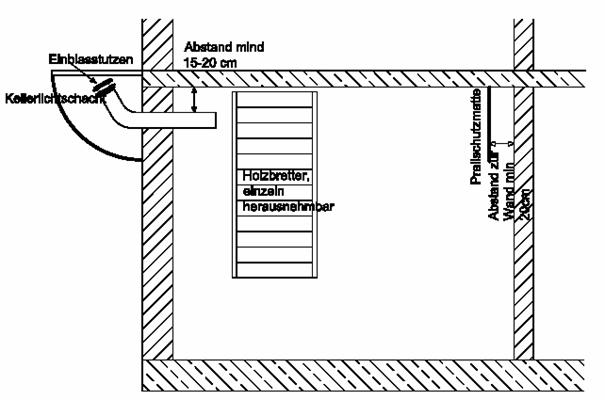 Wenn der Lagerraum komplett unter der Erde liegt, kann der Befüll- und Absaugschlauch über den Lichtschacht angeschlossen werden. Voraussetzung ist ein leichter Bogen von 30° am Ende der Rohre.