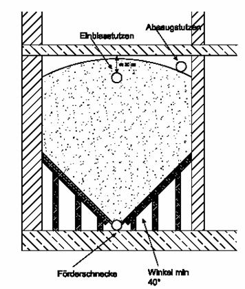 Die Schrägen sollten für eine vollständige Entleerung in einem Winkel von mind. 45° angebracht werden. Es empfiehlt sich die Schrägen nach jeder zweiten Befüllung abzukehren um Staubablagerungen zu entfernen, die das Nachrutschen der Pellets in die Entnahmevorrichtung erschweren.