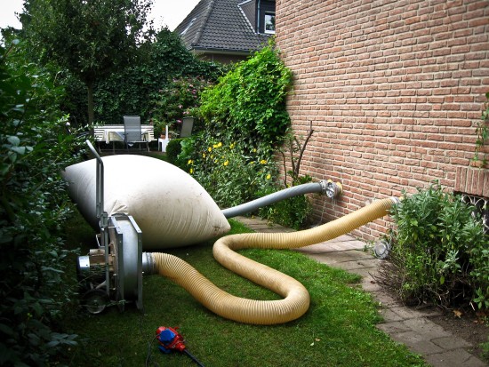 Mit einem den individuellen Gegebenheiten angepassten Druck / Treibluftverhältnis werden die Pellets eingeblasen. Die Schläuche haben einen Durchmesser von 100 mm.